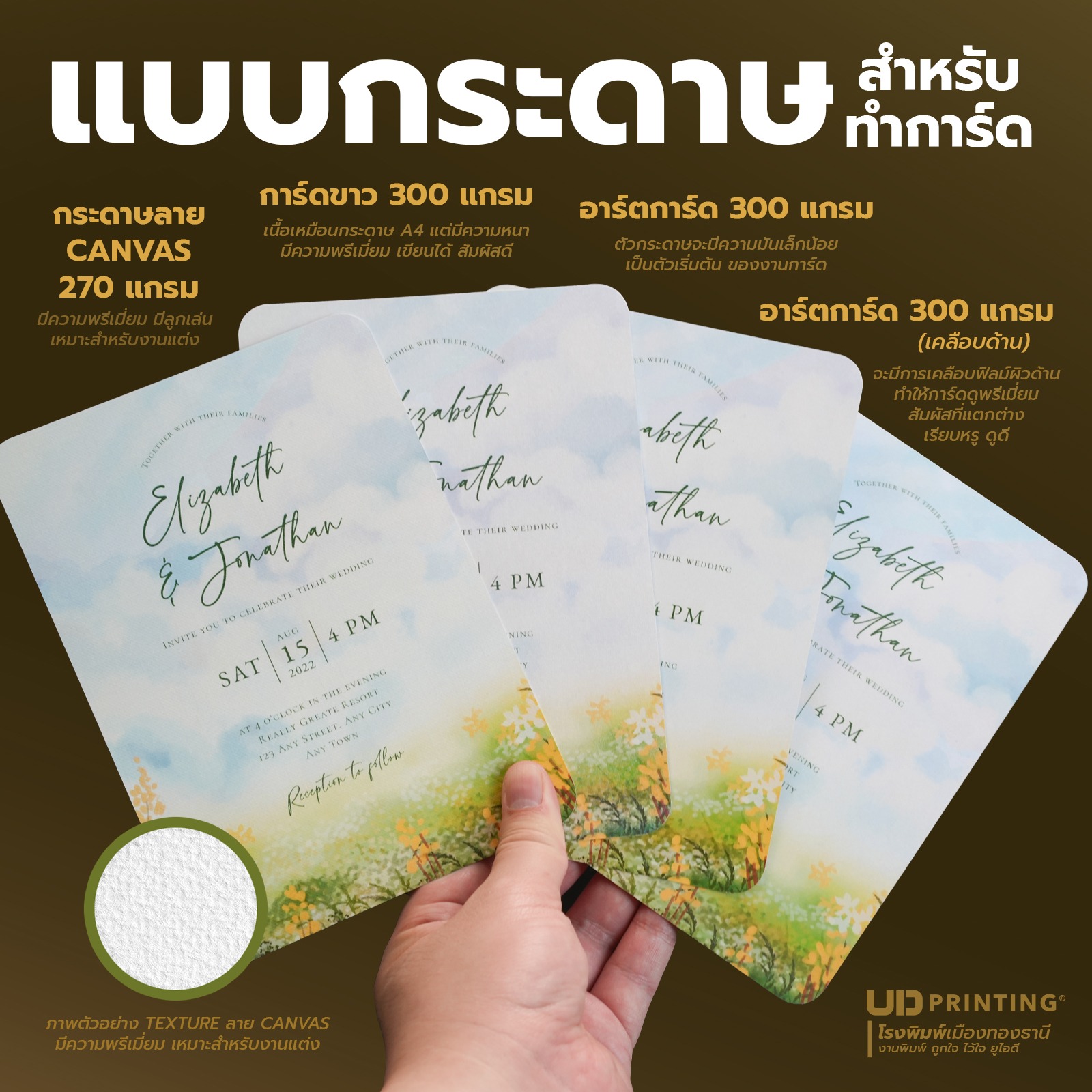 สร้างความประทับใจแรกให้แขกคนสำคัญ ด้วยการ์ดแต่งงานดีไซน์สวย พิมพ์ชัด สีสดใส เลือกความหนากระดาษได้ตามต้องการ